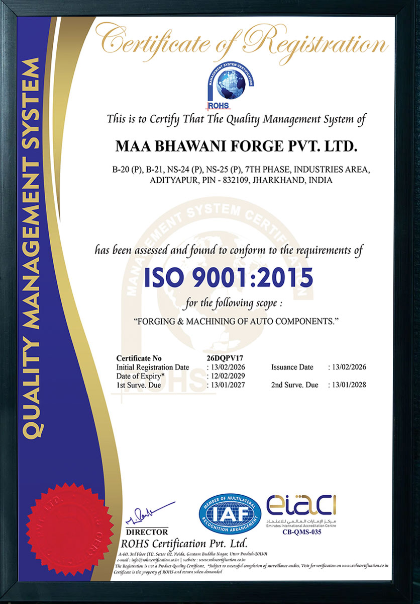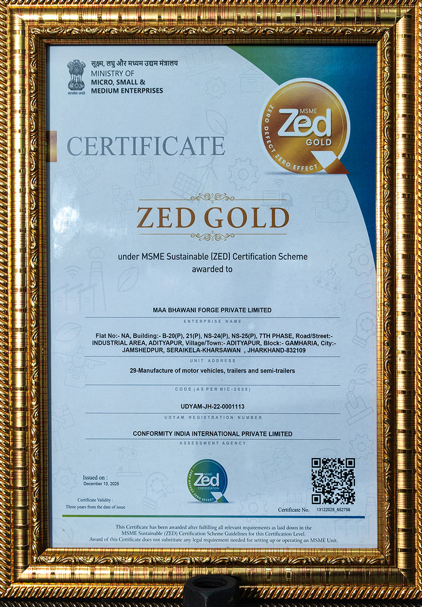 We specialize in Design, Forging, Heat Treatment, and Precision Machining, proudly certified with the ZED Gold MSME Certificate, reflecting our commitment to zero-defect manufacturing and sustainability. Our IATF 16949 certification ensures compliance with global automotive quality standards through robust processes and continual improvement. We are also certified to ISO 9001, demonstrating a strong quality management system focused on consistent quality and customer satisfaction.